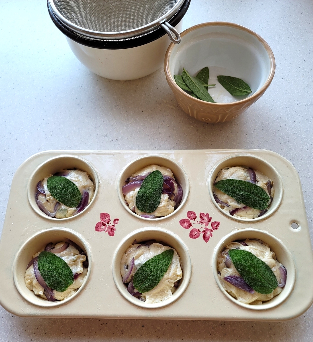 セージからパワーをもらおうと、甘くないマフィンを焼いてみた。材料はスペルト小麦、豆乳、オリーブオイル、セージ、紫玉ねぎなど。